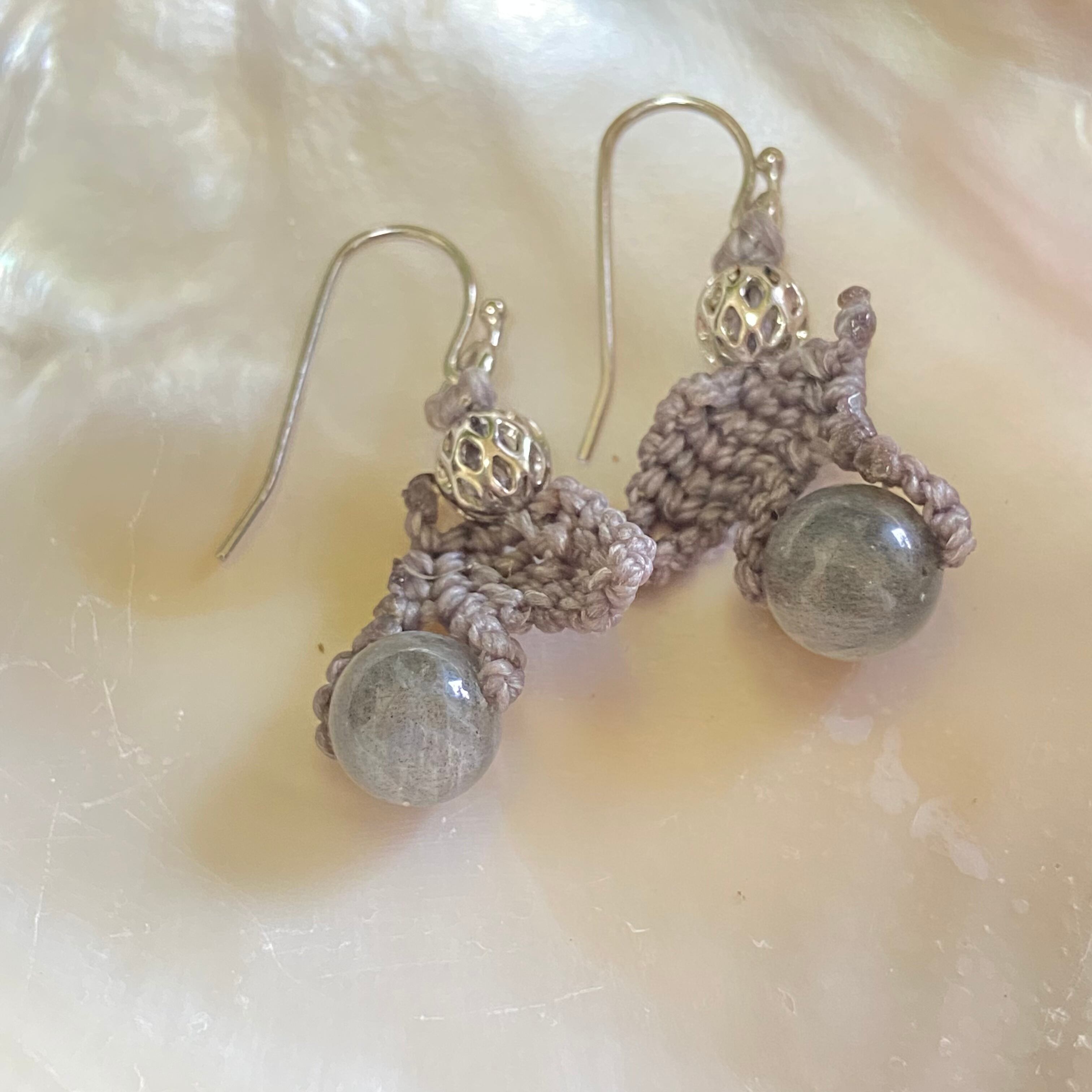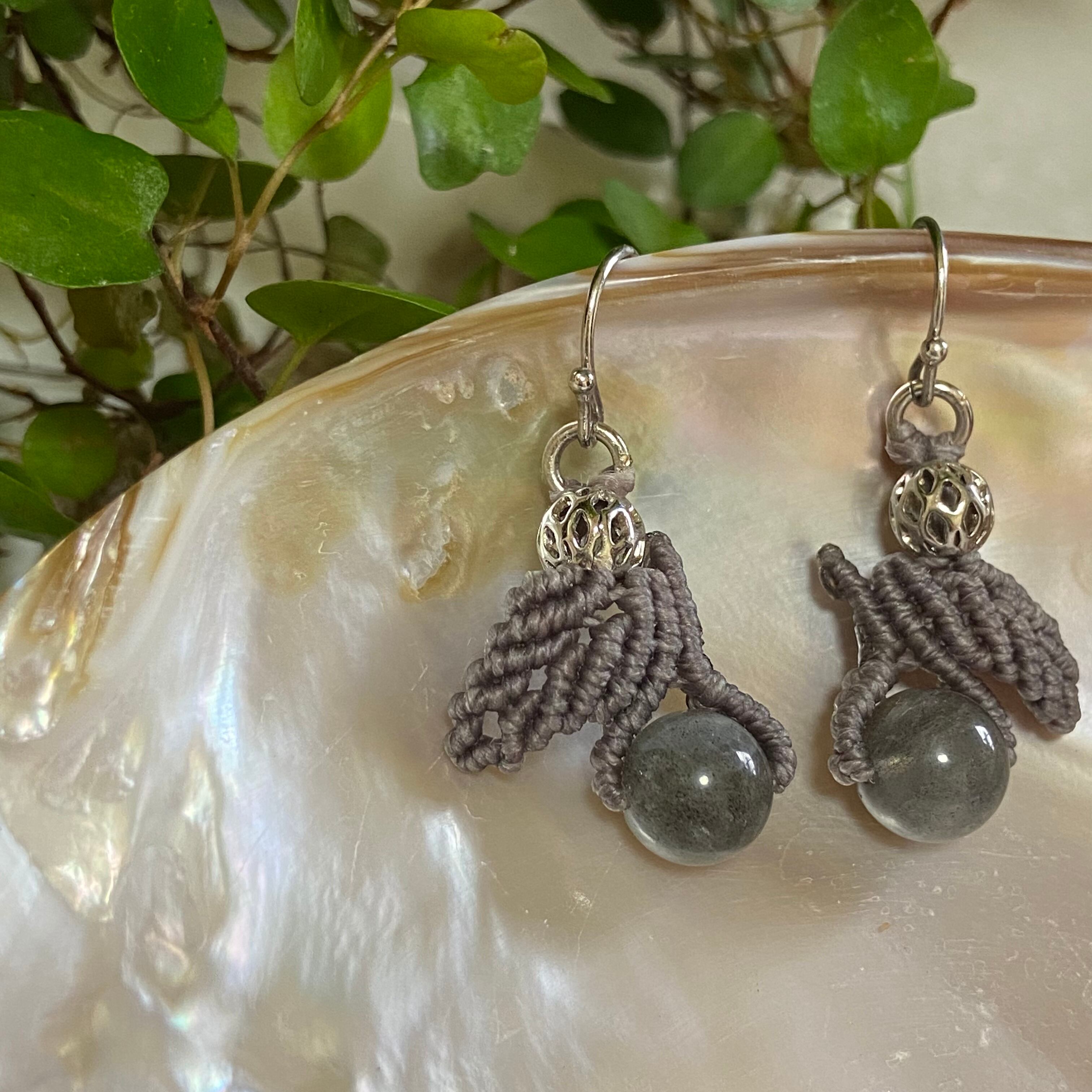 天然石「ラブラドライト」丸玉をマクラメコードで編みました。